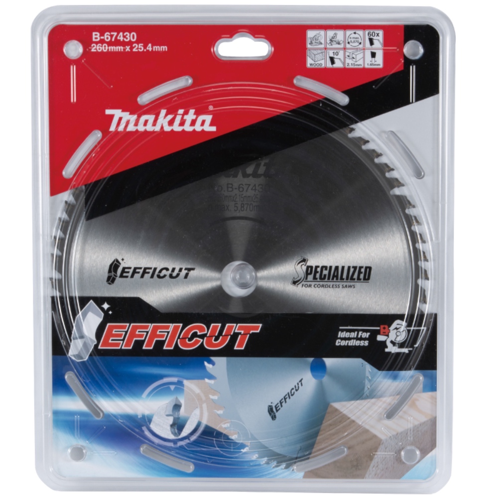EFFICUT circular saw blades have been developed primarily for cordless circular saws. These durable blades are designed with special features allowing them to work very efficiently. The special design of the tips provides a fine cutting surface with little force, excellent chip chute performance and reduced cutting resistance. These features allow the blades to cut faster, cleaner and give more cuts per battery charge. The efficient performance of the blades, means that the tool is inclined to have a longer life. Depending on the blade, the series is suitable for wood, metal, composite and aluminum. The wide range of circular saw blades allows the user to select the right blade for each job; correct blade selection ensures that the job is completed efficiently and gives the blade a longer lifespan.