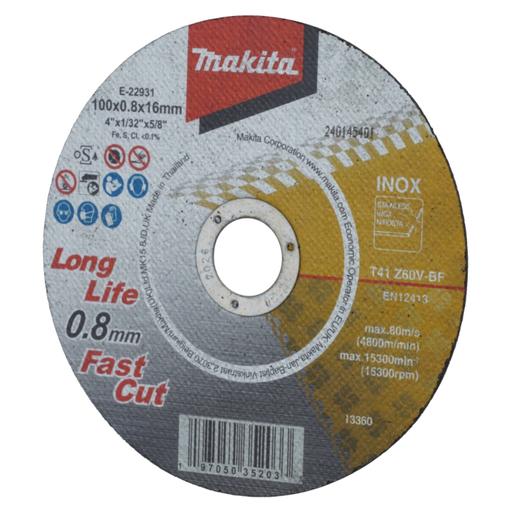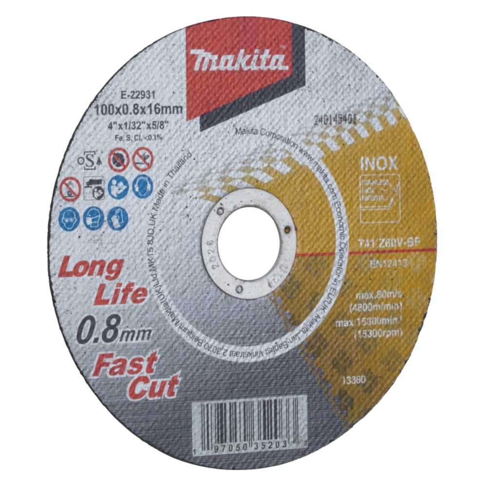 • New 0.8mm thin cut-off wheel with long life. • Suitable for construction industry, steel industry, piping industry, shipbuilding industry, petroleum industry, etc • By reviewing the resin binding material, the life length has been significantly increased. • Less burrs and burns after cutting. • Sulfur-free, prevents rust. • Single item is bulk. • By changing the bond material to the latest type with higher bonding strength than the current item, we haveimproved the life length 185%, which was a weak point of the current 0.8mm thin cutting wheel. • Bond strength/Grade: Expressed by letters from A to Z.Z is the highestbonding strength which is hard to wear. • Less burrs after cutting, ideal for cutting threaded rod. • With thin wheel thickness and high cutting speed, they left less burr and burn after cutting. • With less iron, sulfur, and chlorine wheel, even if it cuts stainless steel, rust is less likely to occur.